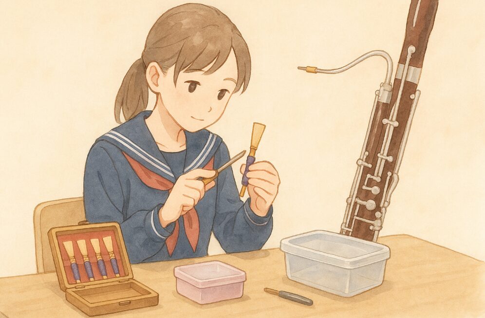 本番や合奏前は、室温に近い水で短時間の湿し直しを行い、繊維の膨張を均等にします。その後、軽く水気を取り、低音域から息の通りを確認しながら反応を整えます。