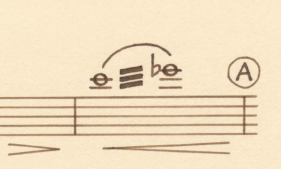 二音間のトレモロでは、二つの音の玉を横に並べた上で、茎にまたがる斜線が描かれ、書かれた音価の範囲を等分して交互に吹き分けます。